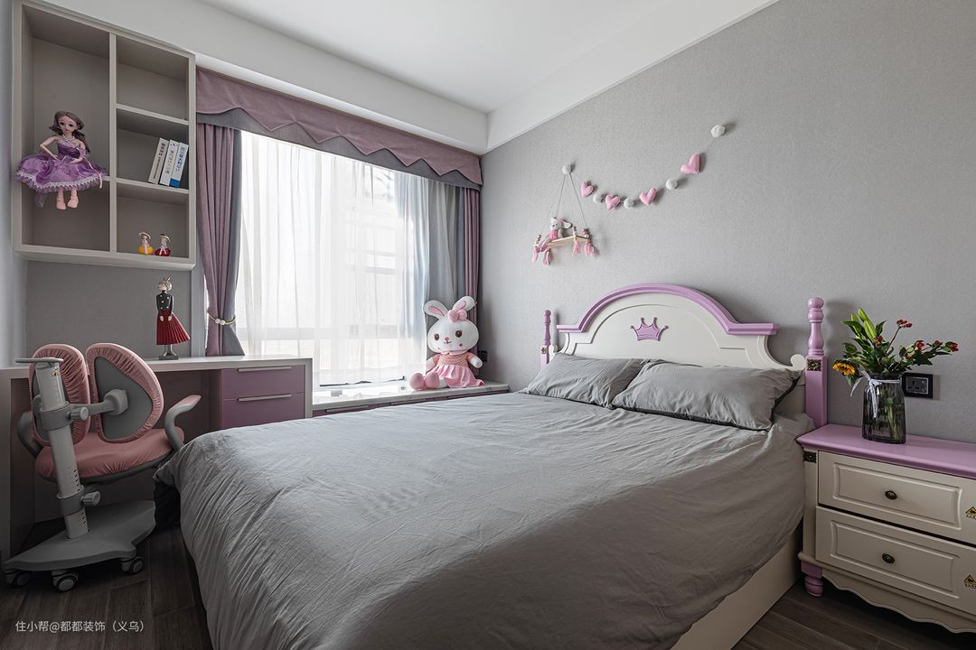 淡淡的灰蓝色是儿童房的主题色,搭配淡紫色的色调,温馨雅致,小摆件灵动富有童趣,可爱活泼。#如何打造安心的儿童房