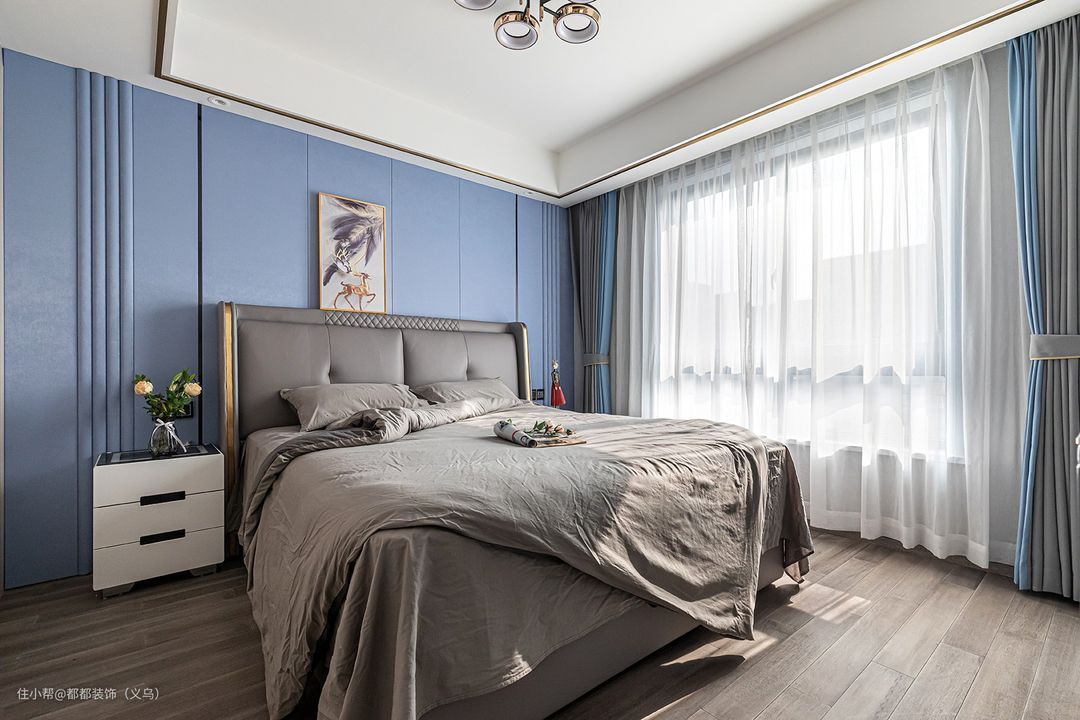 卧室在整体选用了低饱和的蓝灰色,木板铺设,米白色衣柜,简单干净的设计给人以静谧雅致的睡眠氛围。