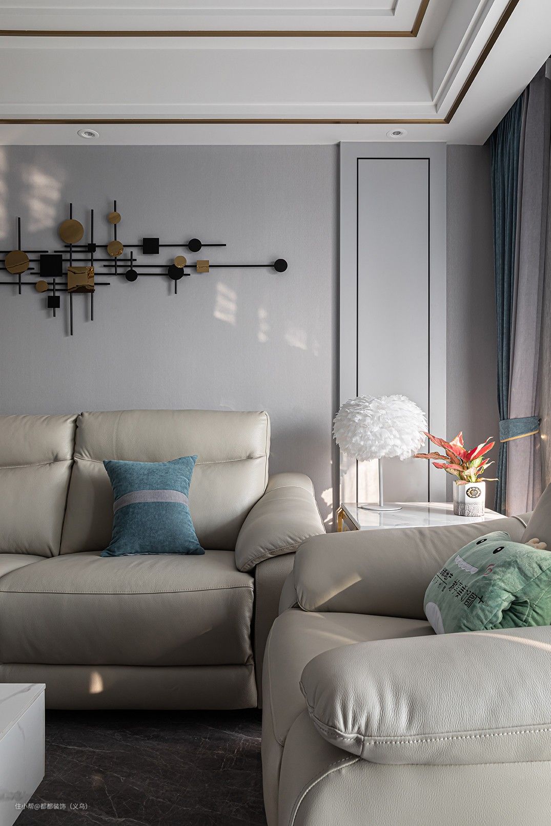 软包沙发略去了过多的修饰与束缚,以奶灰色为主调,局部以蓝色点缀,不张扬不抢眼,低调沉稳中是更适合安静放松的休憩区域。#你家客厅是怎么配色的?