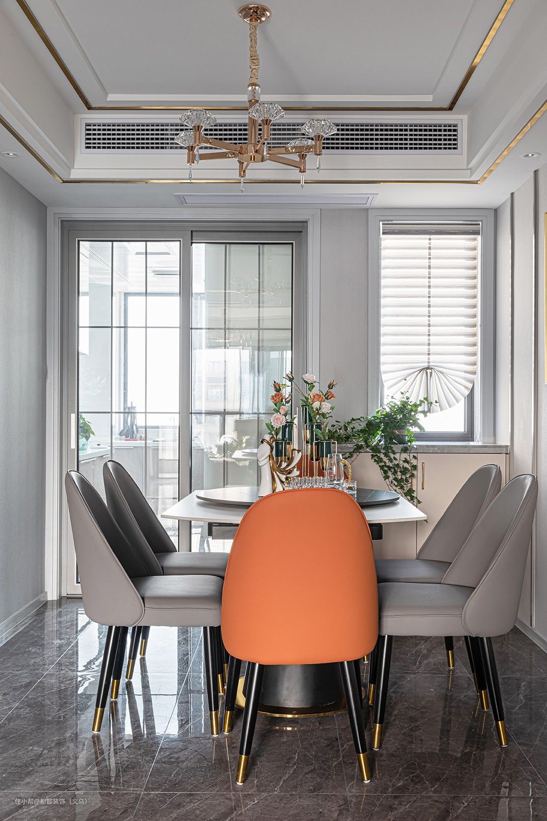 客厅与餐厅采用开放式形式,南北互通,采光更好,互动性也更强。家具材质选取了浅灰白为底色,搭配明亮的橘色,细节处点缀精致金属材质。一开始还担心浅色系容易翻车,最后的效果被夸到爆。