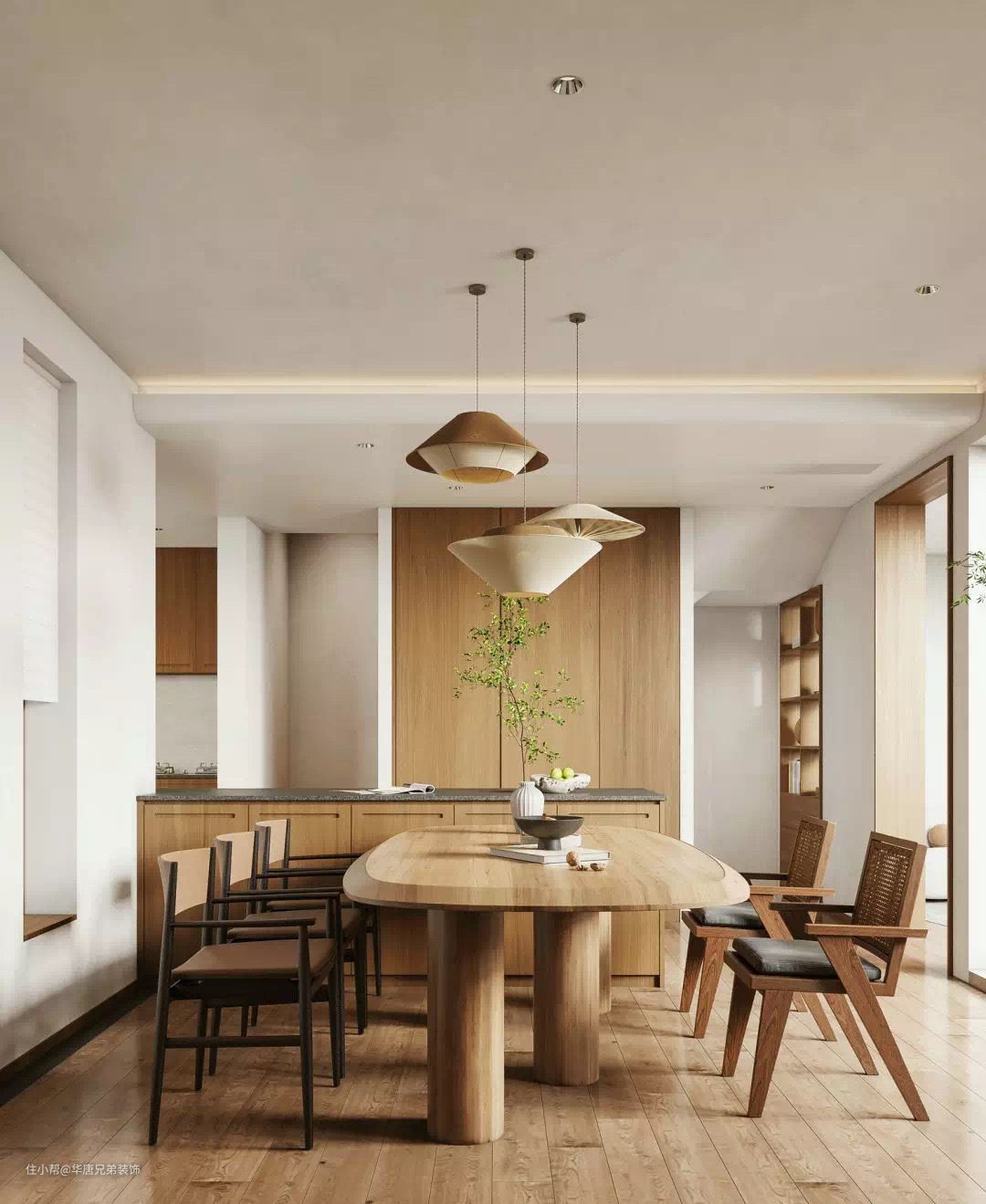 餐厅与厨房一体采用半开放式设计,餐桌与与吧台融为一起,原木色调作为搭配色,餐桌上方的吊灯灯光聚散而下照亮这个充满温暖的空间。餐厅旁边用原木做中式收纳柜,可以存放各类酒品。厨房台面采用L型设计,原木色的橱柜中增加使用度的同时将厨房电器嵌入其中,白色的吊柜与其相互呼应,将空间显得明亮又温馨。