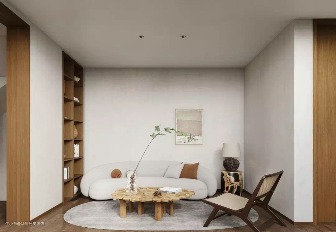白色的布质沙发搭配方正的靠垫,增加效果感的同时也显得更加宽敞。茶几的搭配让整个空间中更佳具备设计美感。沙发背景墙以奶白色为主色,旁边有隔板做出收纳层,提升空间收纳效果再搭配上空间无主灯的设计,照亮整个空间的亮度。