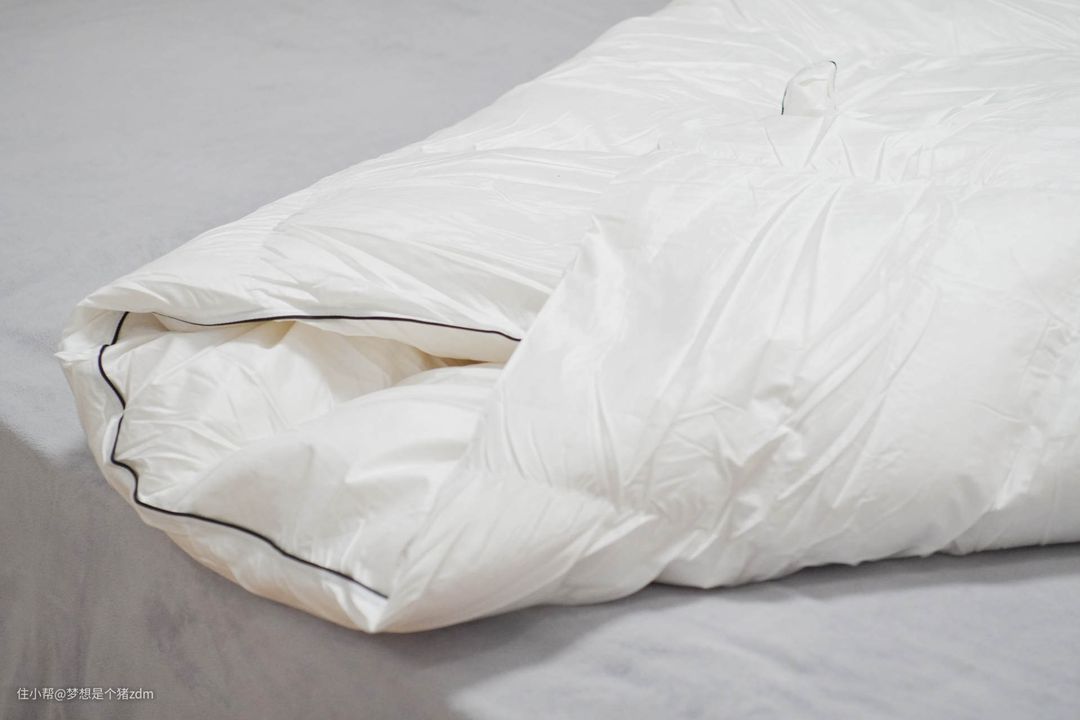 SIDANDA的鹅绒被除了外包装的两层纸盒外,里面还有一个收纳袋,鹅绒被是卷起来装在收纳袋中,我个人比较喜欢这种收纳袋的设计,因为被子能够卷起来塞进收纳袋里,夏天放在衣柜里也不算占地方。这个提醒一下,其实鹅绒被是不建议用真空收纳袋保存的,因为容易引起断绒,影响其保暖性和蓬松度。