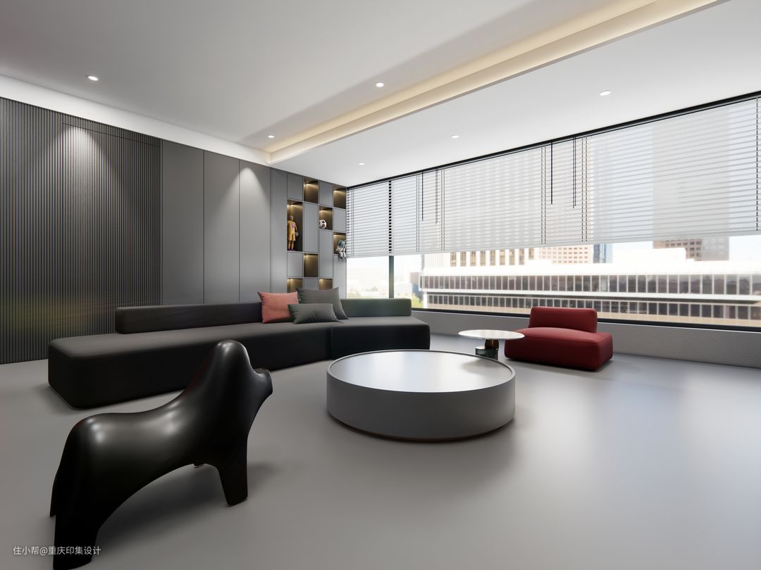 全平板门柜体,简约大气。加上竖条纹,视觉感受上会营造更宽阔的空间感。炭黑色的布艺沙发,质感轻柔,也充满精致商务感。与殷红的沙发形成强烈对比。