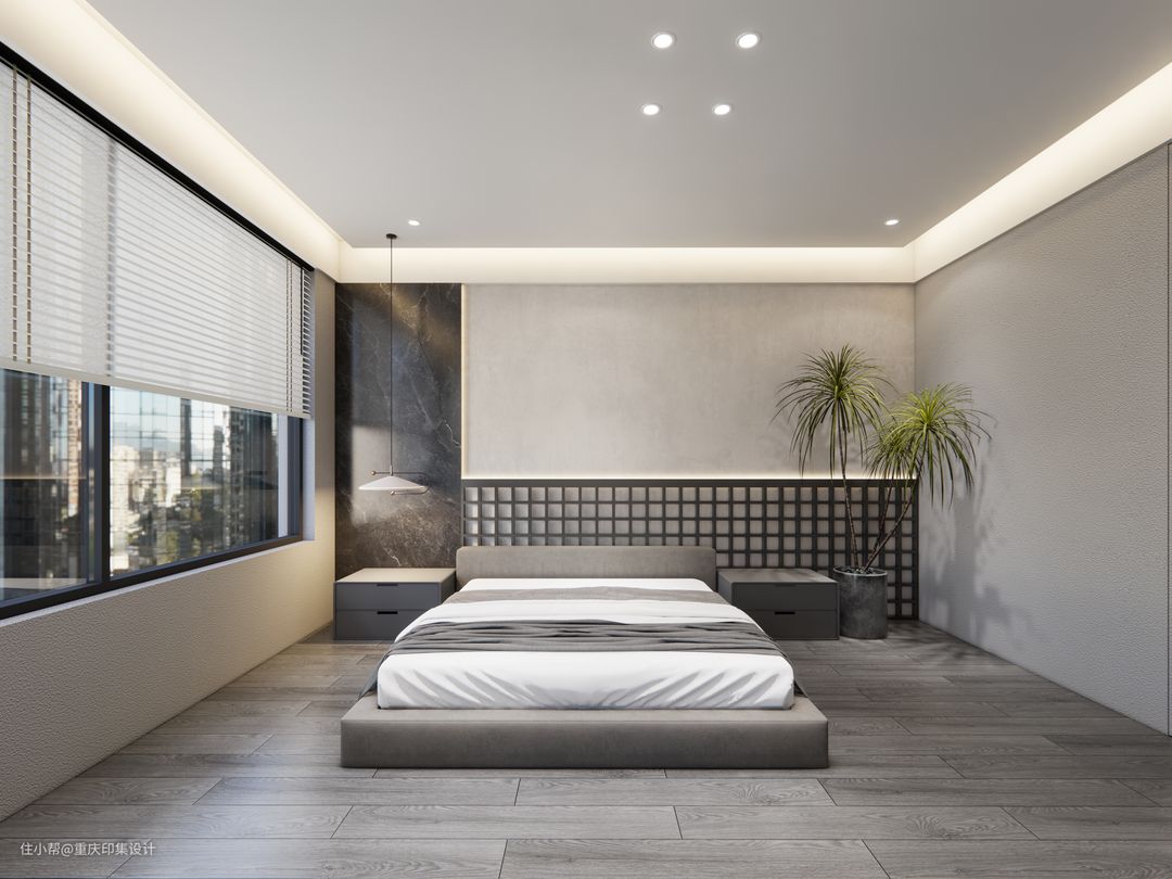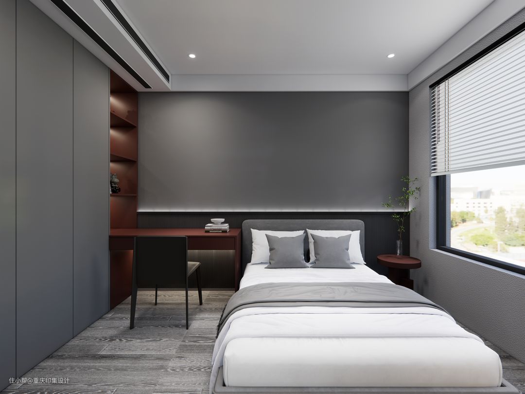 次卧作为预备空间,功能完备齐全,保持着肖碳色的精致,也利用殷红色和灯光营造了温馨的氛围。