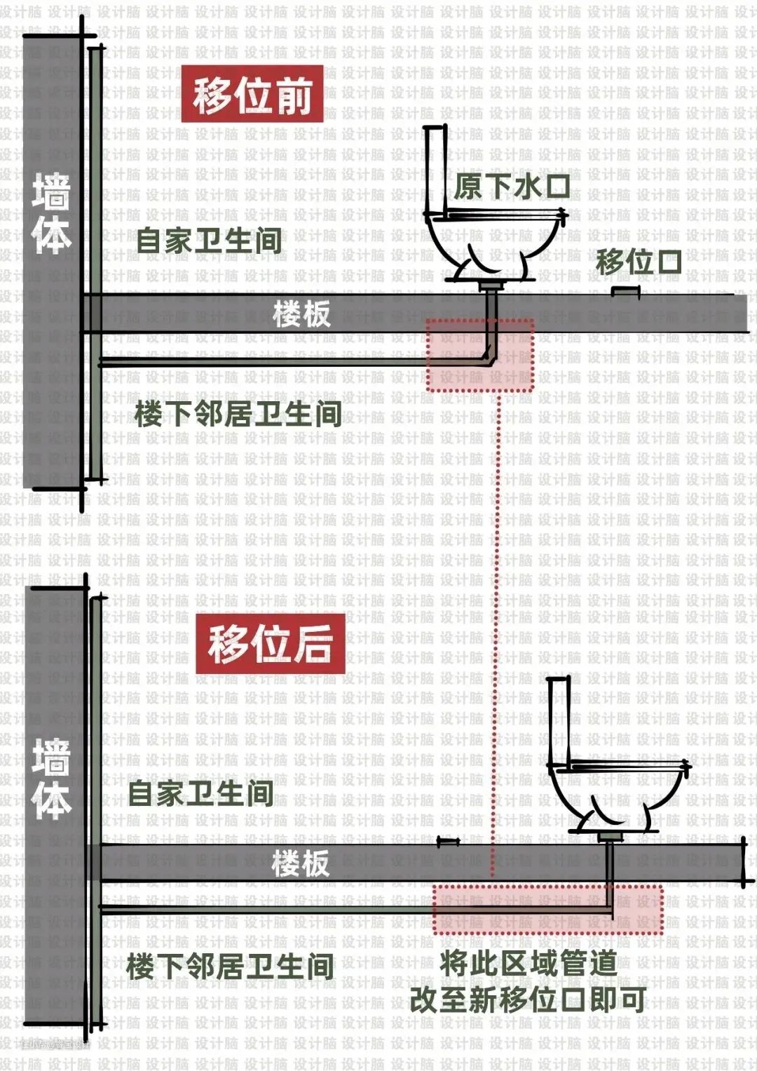 4、改变楼下排水管道来进行移位