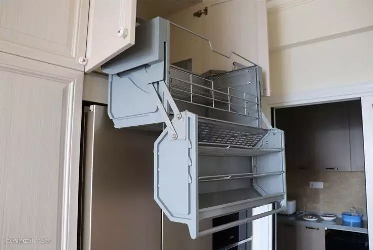 除了升降拉篮,其他吊柜上的拉篮应用就没有这么广泛了,因为这些拉篮往往要和柜子一起定制,单买或后加都没那么方便。