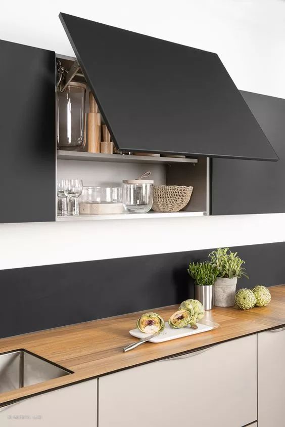 看上去非常Fancy的上翻门有很多种形式,有平移上翻、斜上翻和折叠上翻门。这些门对身高要求较高,我曾经在宜家手贱掀开了一个上翻门,然后就关不上了......为了避免这种尴尬,壕友们可以装个电动的,摁一下橱柜边上的按钮它就自己回来了,还能和客人们秀一把优越。