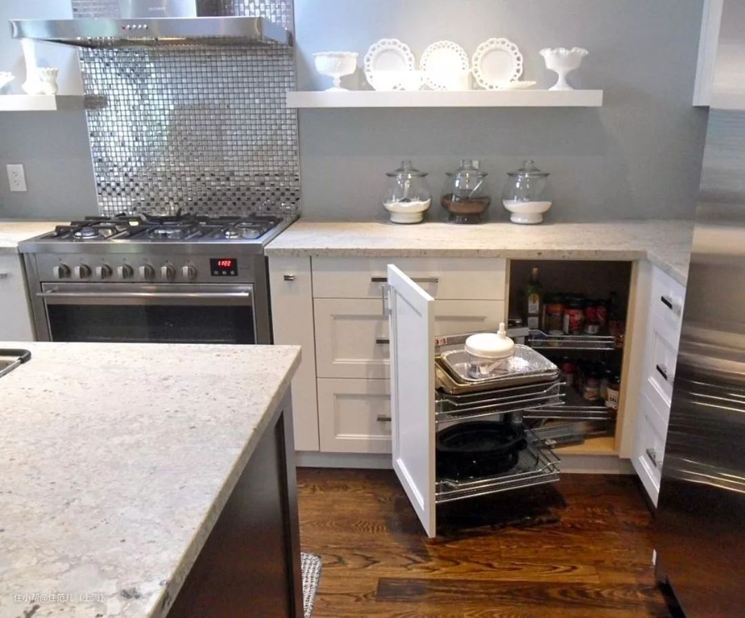 稍微大一些的厨房用的都是L型、U型的橱柜,难利用的转角柜随之出现。老外管这叫盲角柜(Blind Corner Cabinet),堆满了被遗忘的无用品,还很难做断舍离和打扫卫生。