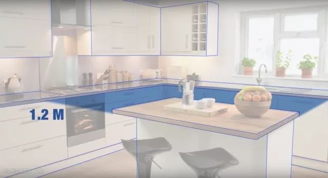 不过,这些标准不是恒定的,小一定的厨房也可以根据自身情况作出相应改变。如果把中岛当成传菜台,人就不用端着菜绕过中岛,中岛和墙面的距离有个70cm也够用了。两侧柜门同时打开的情况不多,若是空间没那么富余,留出80cm也够一个人蹲下打开地柜找东西或打开洗碗机放碗(具体留多少视做饭者身高而定)。