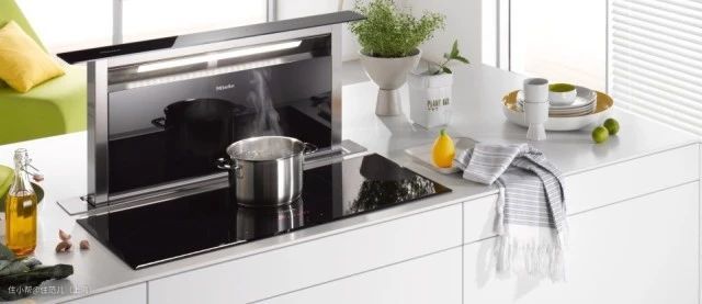 除此之外,若是饮食清淡或不怎么做饭,隐藏式升降烟机也是不错的选择。在中岛上炒菜时,为了防溅油一般会装个30cm高的挡油板,有隐藏式升降烟机就不必多此一举了。