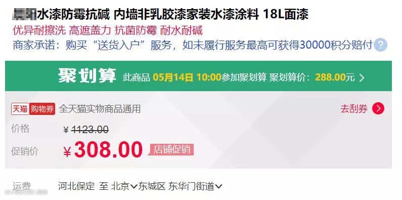 上 308元18L的面漆,也就是立邦低端产品的价格,图源:taobao.com