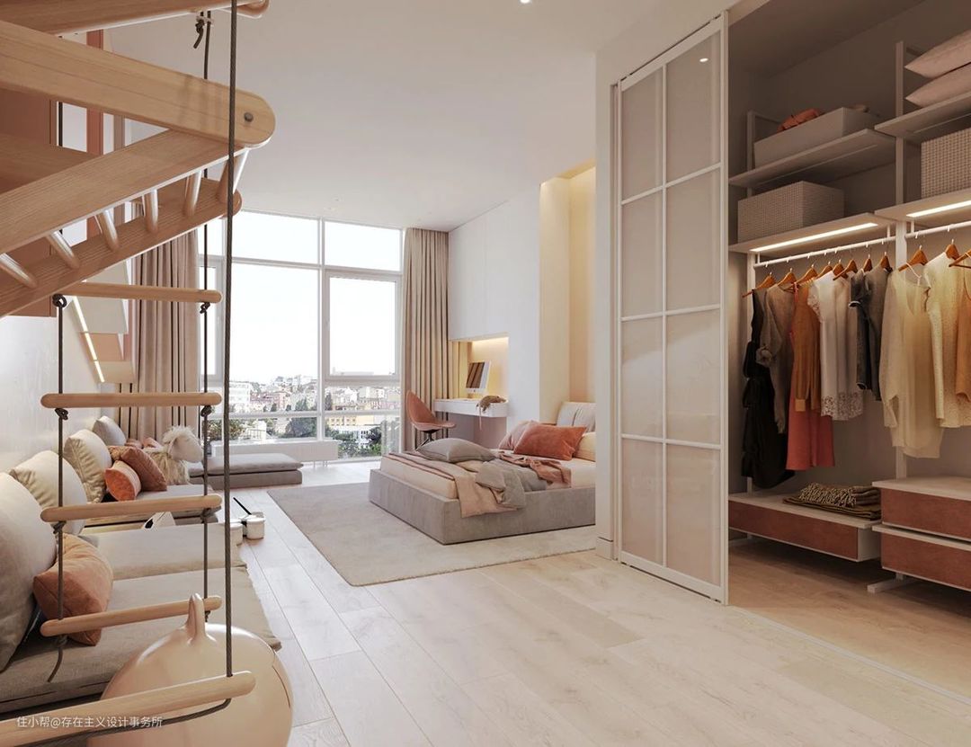 我们给小姐姐划了一个2~3㎡的小衣帽间除了收纳平时的衣服之外,还可以收纳被子枕头等杂物做了一个推拉门,那就算是有其他人进入到房间里,也可以保有属于自己的隐私啦😎