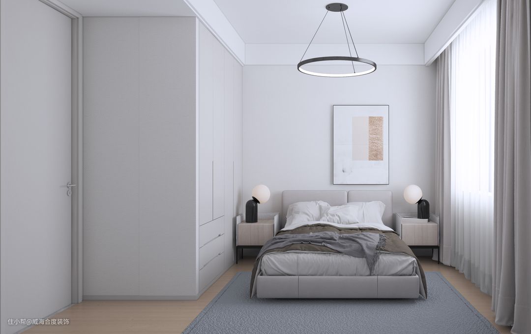 卧室里一般会很少有梁存在,很多人会直接粘一圈石膏线,不过因为窗帘盒的存在,会让石膏线略显单薄。所以,卧室更倾向于用双眼皮吊顶,现在一般会在卧室门口的顶上局部吊一块平顶,这样做衣柜更美观,圈线也更好收口。