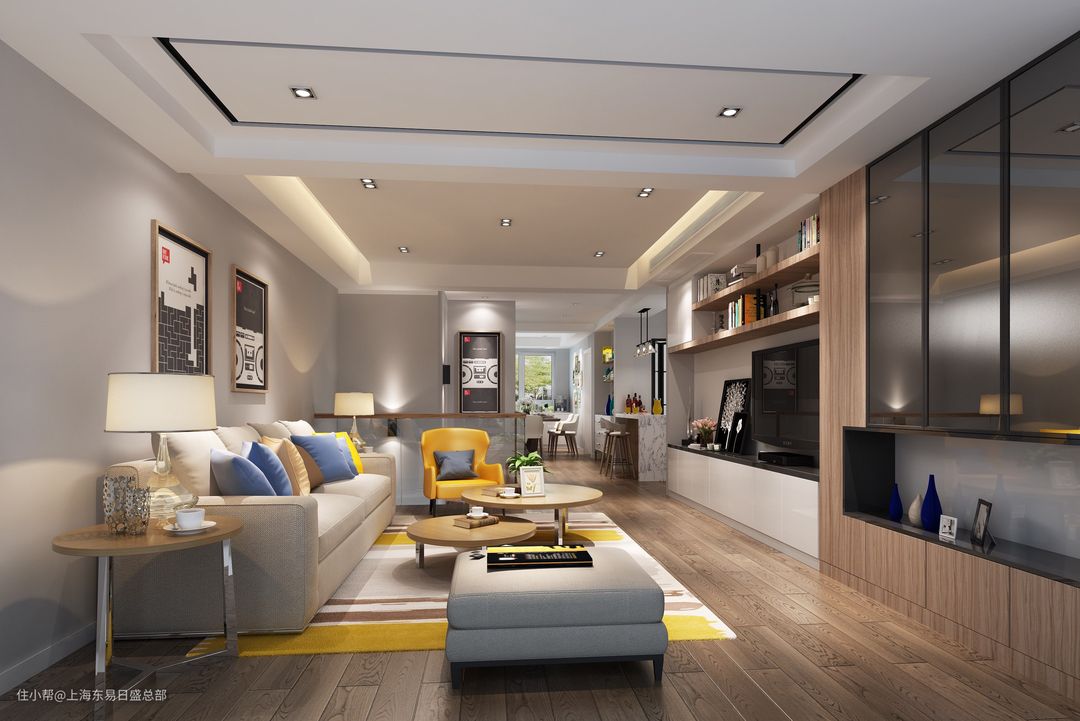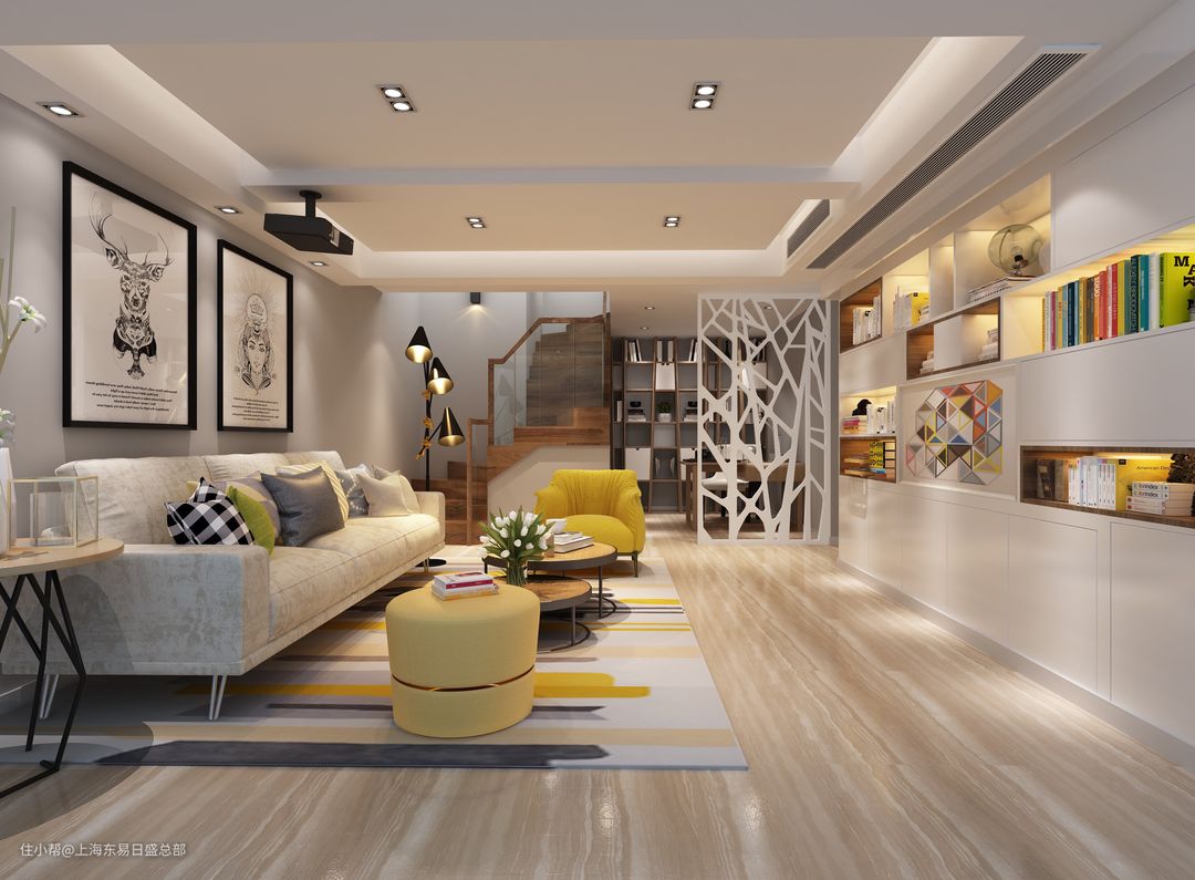 横纹铺设的木地板舒适干净,与内嵌式书柜打造了干净敞亮的视觉空间。书柜做开放式处理,内嵌明黄色灯带,取放书籍时更方便。米白色沙发搭配亮黄色单椅,打造简约干净的休闲区域。