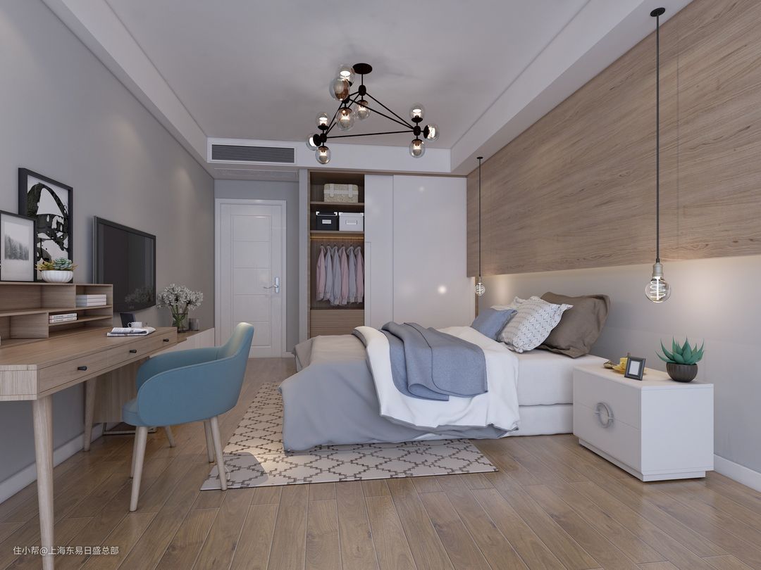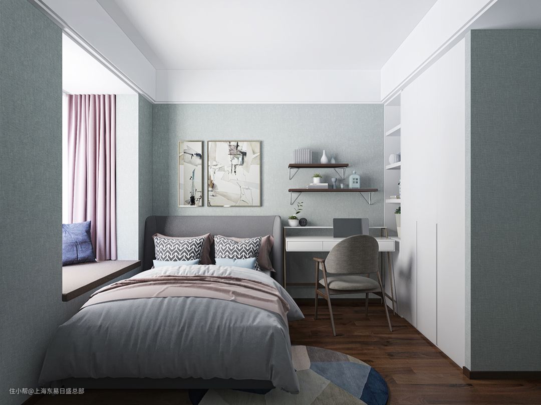 整体硬装使用了清新的浅青色,壁布质朴舒适与灰色的床品相辅相成,打造了一个舒适无压的空间。梳妆台放置在开放式橱柜和床品之间,可以做床头柜使用,墙面添加隔板放置小摆件,清新雅致。