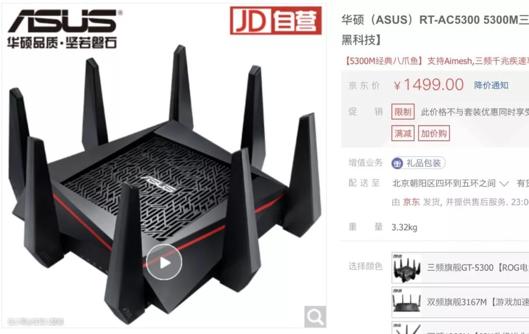 上 华硕好的路由器还是挺多的,性价比最高的AC66U,翰哥说比它贵的都推荐。AC86U性能最强,但发热有点厉害,AC88U也不错,AC5300是企业级路由了,住范儿办公室也在用,八爪鱼的 造型很惹眼 图源:jd.com