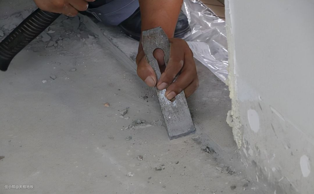 - 清理施工现场。把地面上的垃圾、灰尘、石子等清扫干净,这一点很重要,如果说地面有小沙粒或者小石子很有可能会划破在这上面铺的地膜,水分就很容易侵入,影响实木地板寿命。