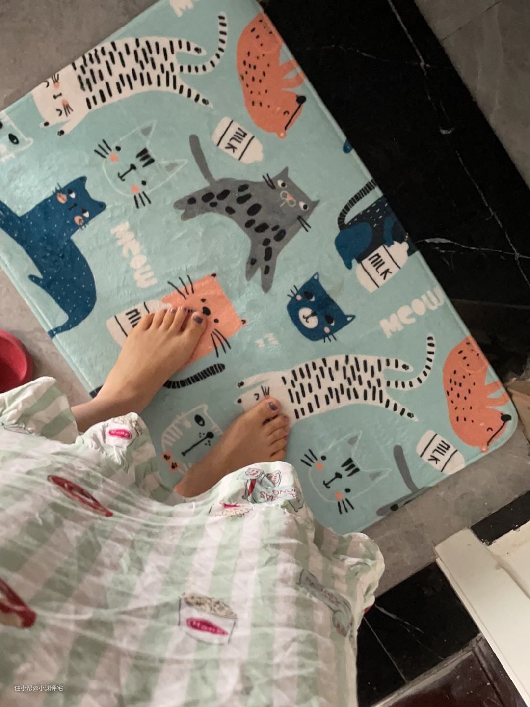 脚垫我换过很多种,传统的布脚垫肯定不能用,吸水速度太慢,吸水量太低。洗一次澡,整个脚垫能拧出水来。而且因为脚垫清洗的频率比较低,时间长了容易滋生细菌。