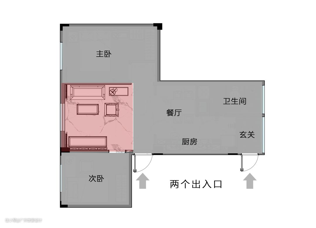 “T”字户型,有两个出入口,设置了玄关在离客厅较远的大门处。