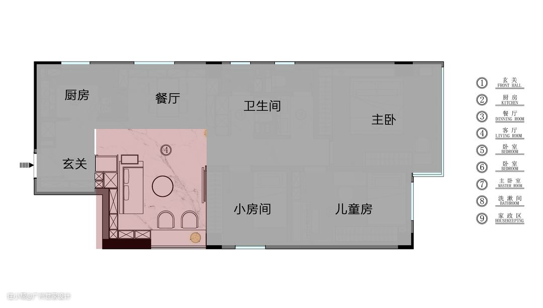- 玄关在客厅的另一头,就不用担心私密性的问题,但还有一个门在客厅和餐厨之间,需要留出一个过道,因此客厅和餐厨之间的过道就比较宽;