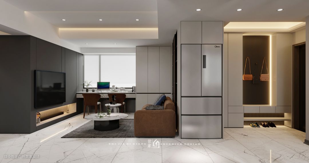 - 玄关和客厅不隔断,但客厅面积较大,活动区域摆放在靠窗的位置,尽量不暴露在大门视线所及处,加强隐私性;