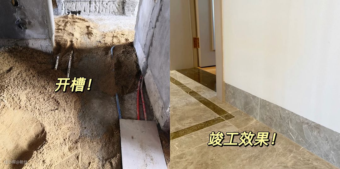②嵌入式踢脚线:虽说效果好,不会藏灰,但施工复杂,需要墙面刻槽,费工费钱,还影响墙体承重,家用成本太高,不划算。