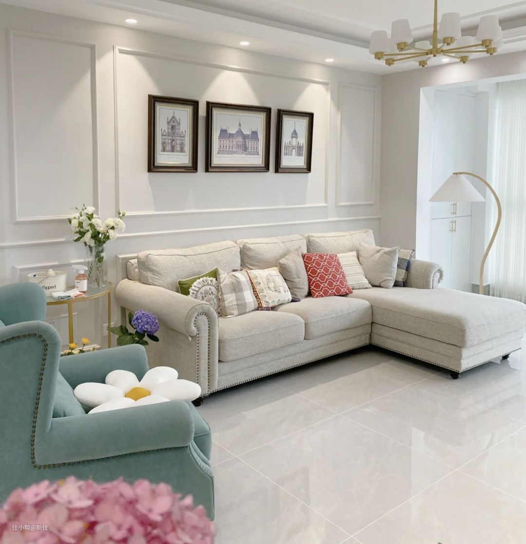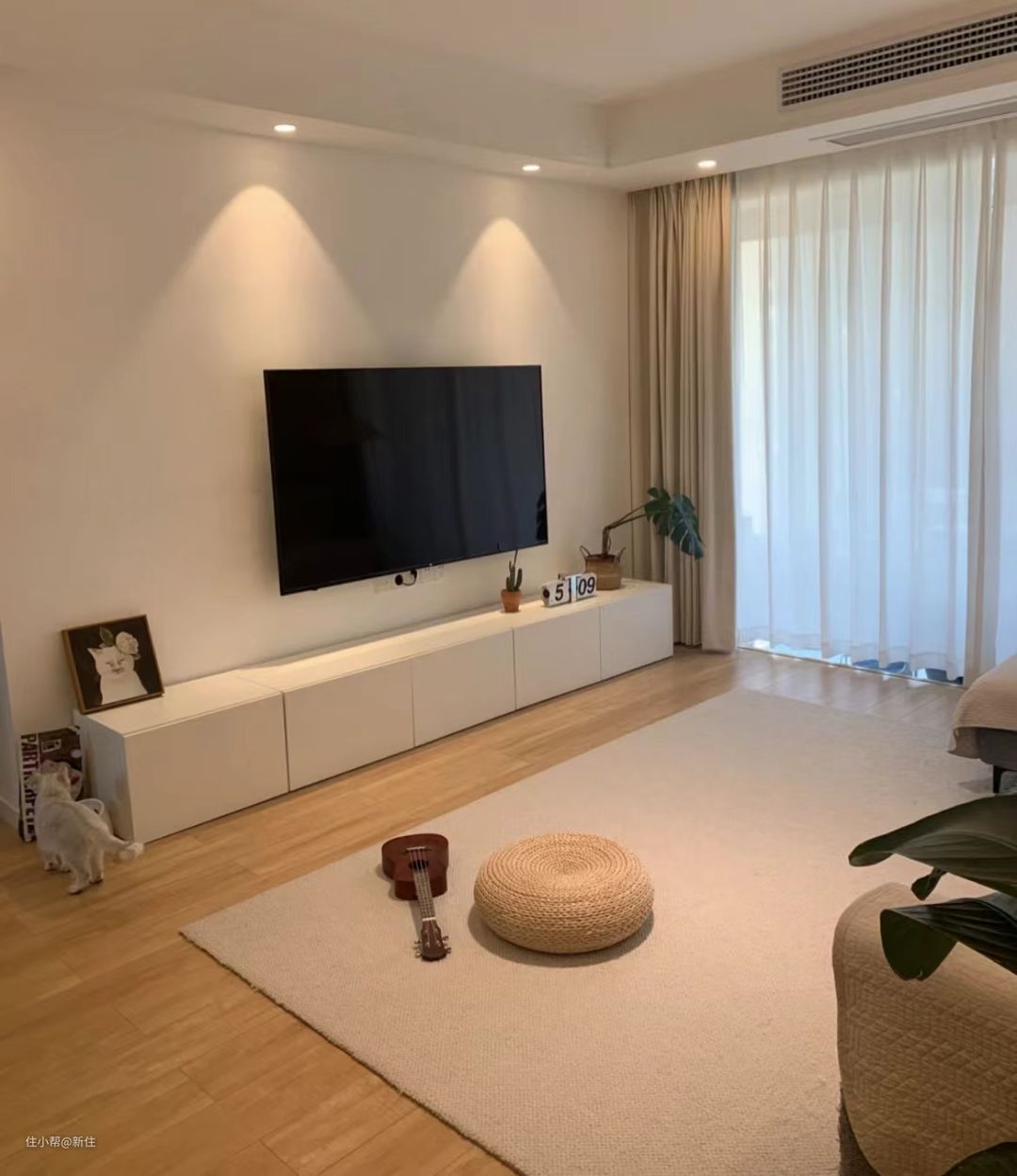 新住建议:因为电视背景墙已经做了区分,沙发背景墙建议以简单为主,可以大白墙或跟随全屋风格,壁纸或彩色乳胶漆等,搭配挂画,并用射灯提升氛围感,简约耐看。