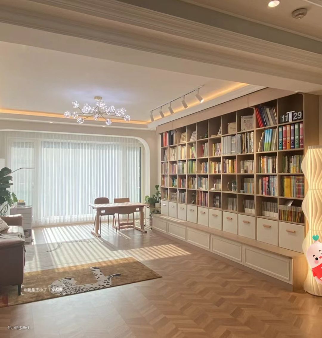不想装电视,家里书籍较多的话,也可以做满墙书柜,居家学习氛围感更足。