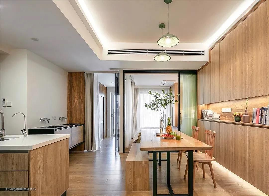 温馨的色彩和木质的纹理和谐交融,整个空间的视觉呈现效果十分舒适协调,百搭不易出错。常见的应用风格有北欧风、日式风、新中式等。