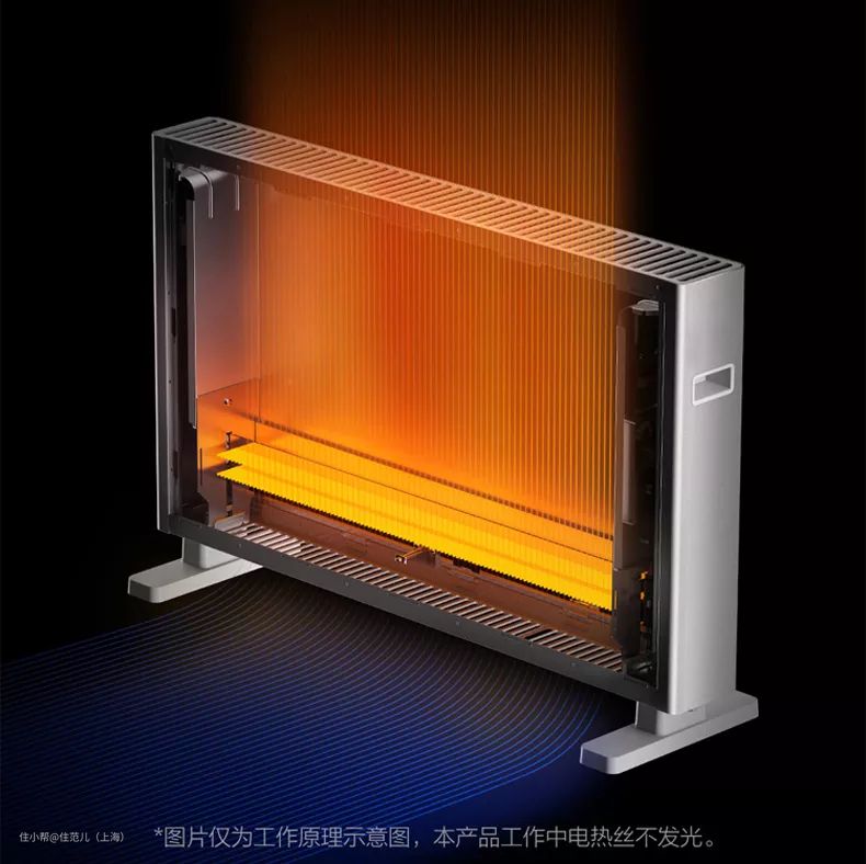 它的厚度和油汀差不多,很明显的标志是,可以看到几片竖直安装、像太阳能板一样的电热膜。