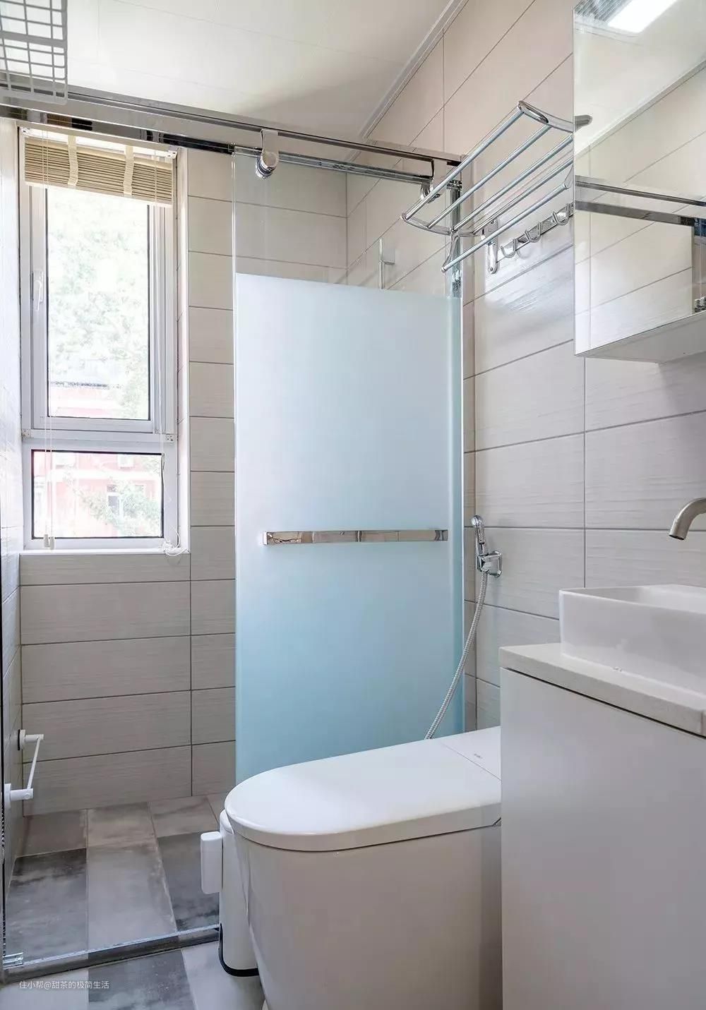 为了节省空间,卫浴都选择了小尺寸款式,洗手台、马桶和淋浴区依次排开,并用玻璃做隔断,以保证干湿分区。内部配色选择了素雅的浅米色墙砖和灰白相间的地砖,简洁又显大。