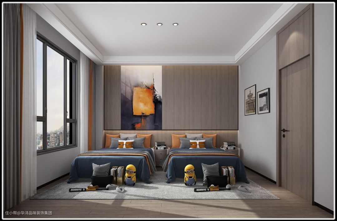 儿童房以木饰面为主,颜色淡雅清新,墙壁上挂着现代艺术画作。大面积的窗户,可以能保证室内通风和采光。双人床设计,可以让家里的两个男孩在此一起聊天娱乐,增加兄弟间的亲情。