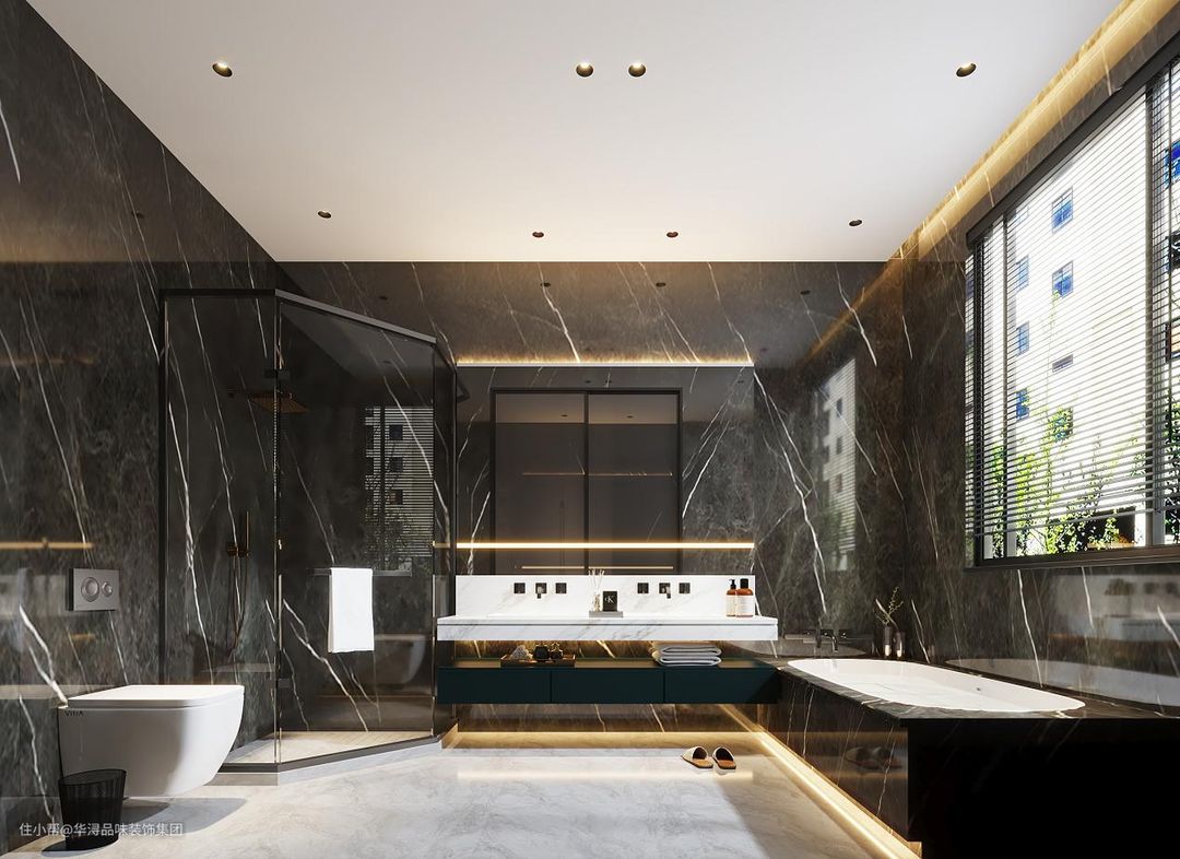 卫生间四周墙壁采用黑色岩板打造而成,让空间看起来更加光滑,依靠墙角设置了干湿分离的淋浴区,靠窗则打造成为浴缸,让居家舒适感直接拉满。
