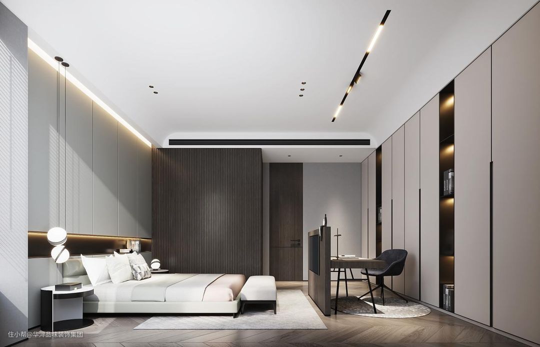 次卧内部设计同样时尚,床头背景墙采用白色的饰面板打造而成,中间留有缝隙配备了灯带,作为床头储物空间,床尾处整面墙则打造成为衣柜,封闭式的柜门采用能够起到防止落灰的作用。