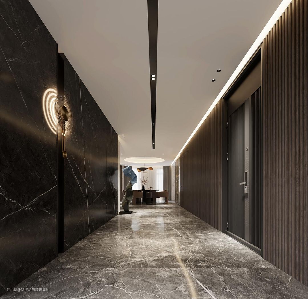 通道一侧的墙面采用纯黑色大理石墙砖打造而成,另一侧则是深棕色竖向条纹饰面板进行铺设,二者相互结合, 墙面上仅有简单的灯带用于补光,让玄关通道处呈现出一种光滑有质感的感觉。