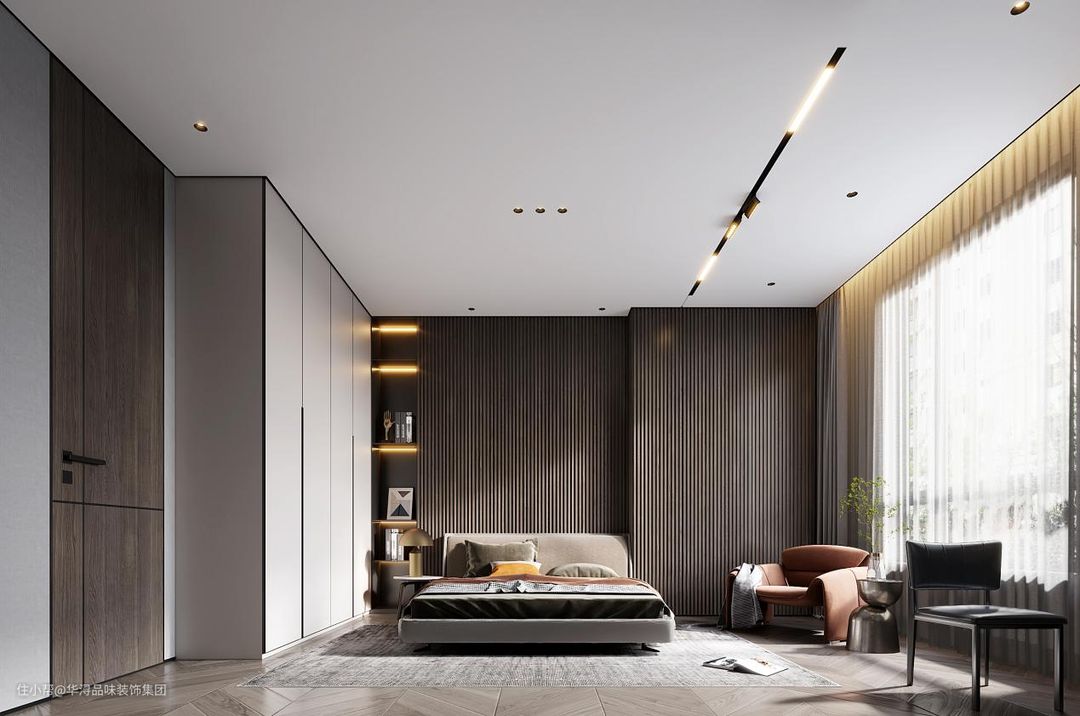 床头背景墙采用深棕色条形饰面板通铺,依据墙体的走势打造成为双层结构,床体正好依靠墙壁放置,仿佛设计好了一般。床头一侧还打造了一竖列的储物柜用于增加收纳空间。