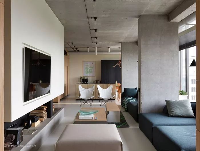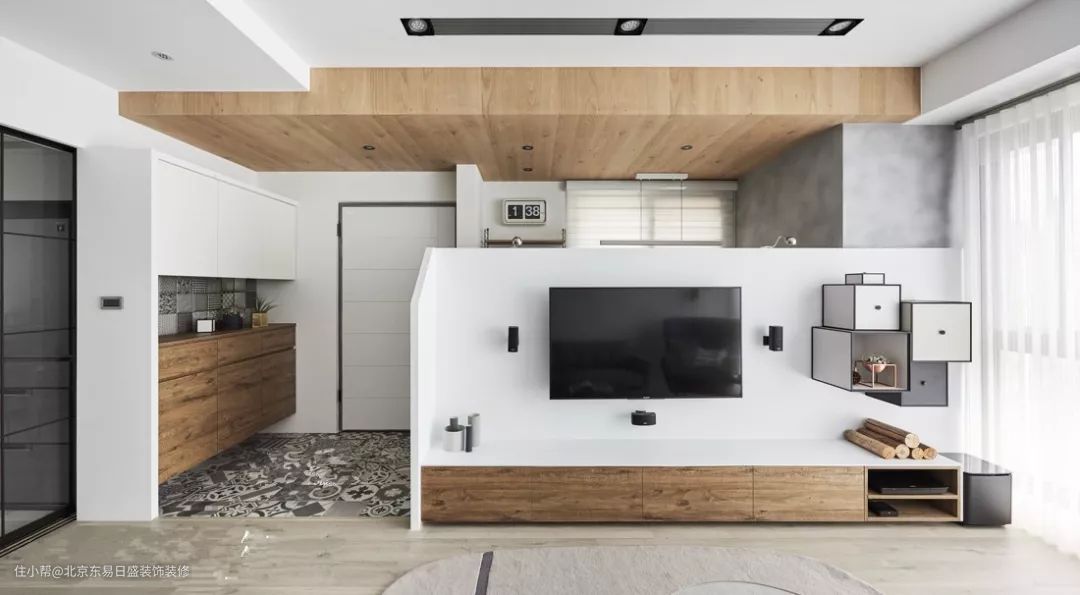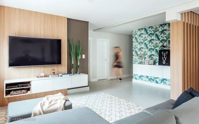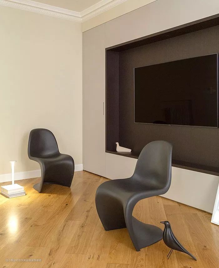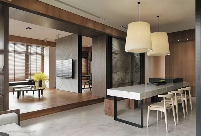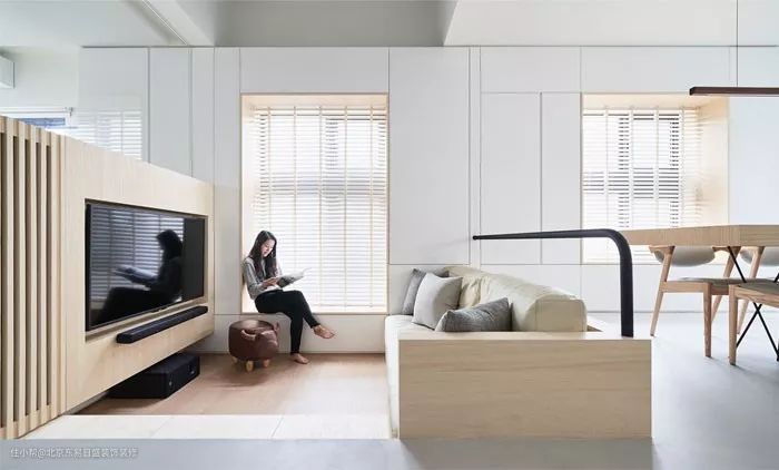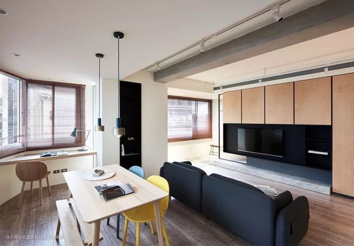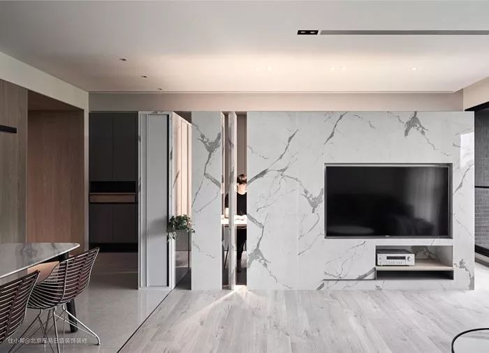 这个案例,区别于上面的白色墙壁,选择了黑色收纳柜+木质电视框,与边上纯白墙壁的餐厅做了明显的空间区分。