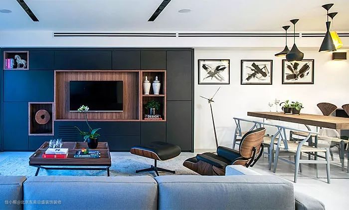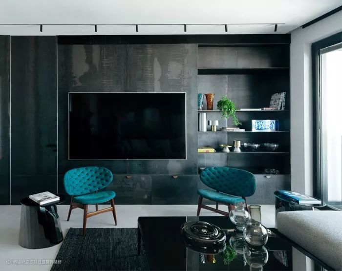 黑白蓝三色布局,电视与黑色的柜子、小茶几、暖器相互呼应。