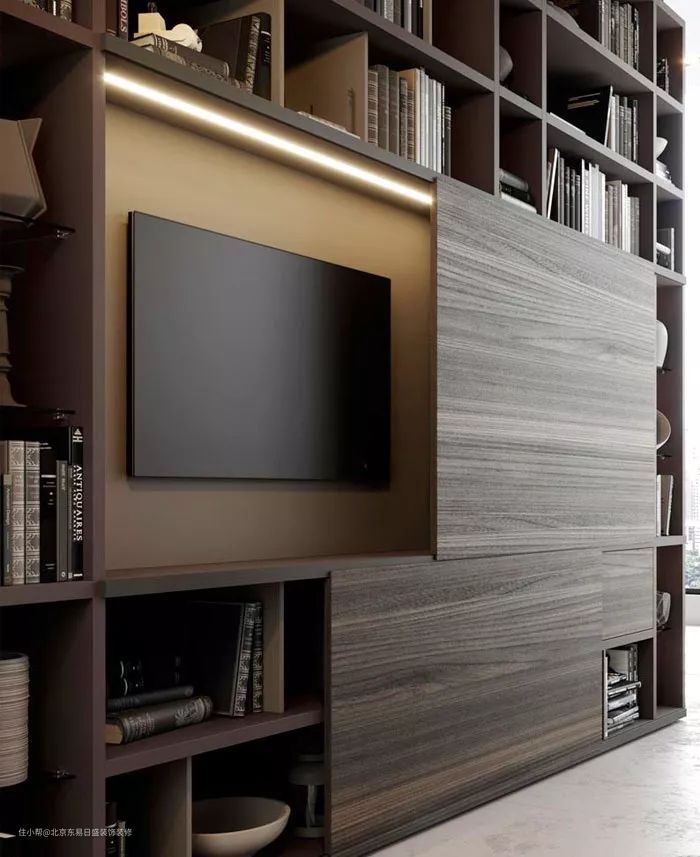 收纳之外,玩个更加高级的——"藏起来”。给你的收纳柜们额外加一个可以隐藏或显示电视屏幕的滑动面板。