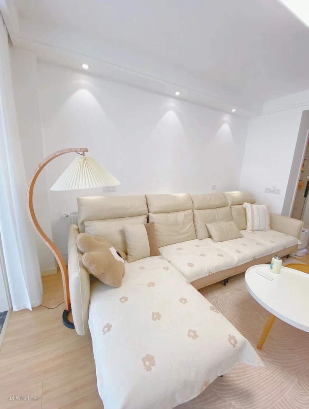 大白墙在视觉观感上,给人扩大空间的视觉感受,木地板通铺也很重要,线条感使视觉具有延伸性,客厅就显得更大啦!