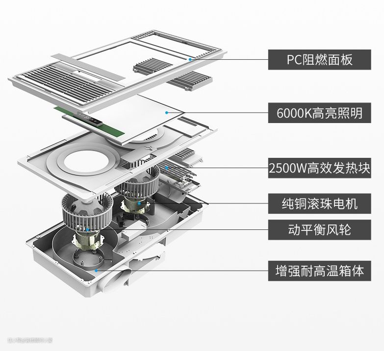 前几年装修大家选的基本是灯暖浴霸,不过如今随着技术的进步,市场主流是风暖浴霸,所以重点讲解一下风暖浴霸的结构:
