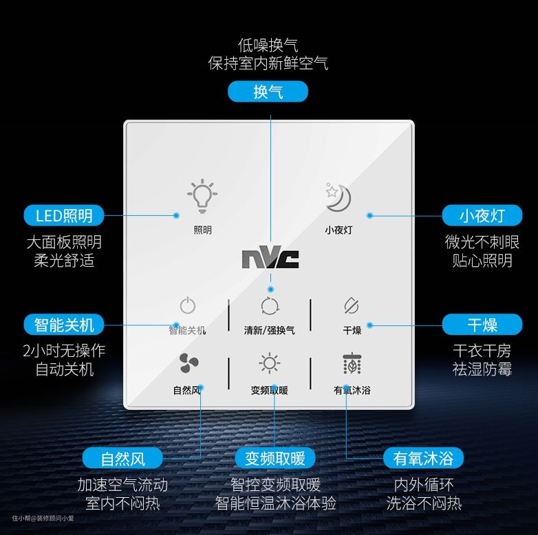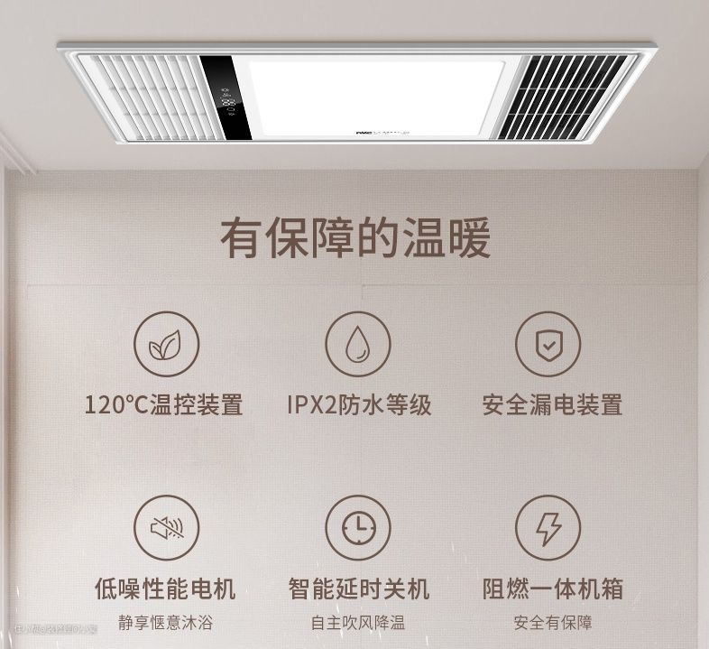 风暖:取暖、照明、换气、吹风是基本。附加功能:变色光、除湿除味、自动断电、手机控制等。
