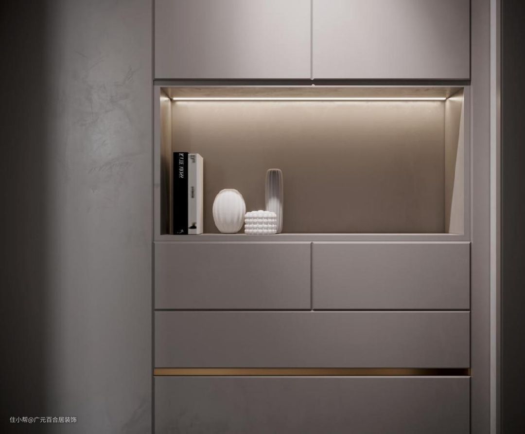 一边的收纳柜设计,按照业主的需求与生活方式来定制的。整体灰色高级又有质感。