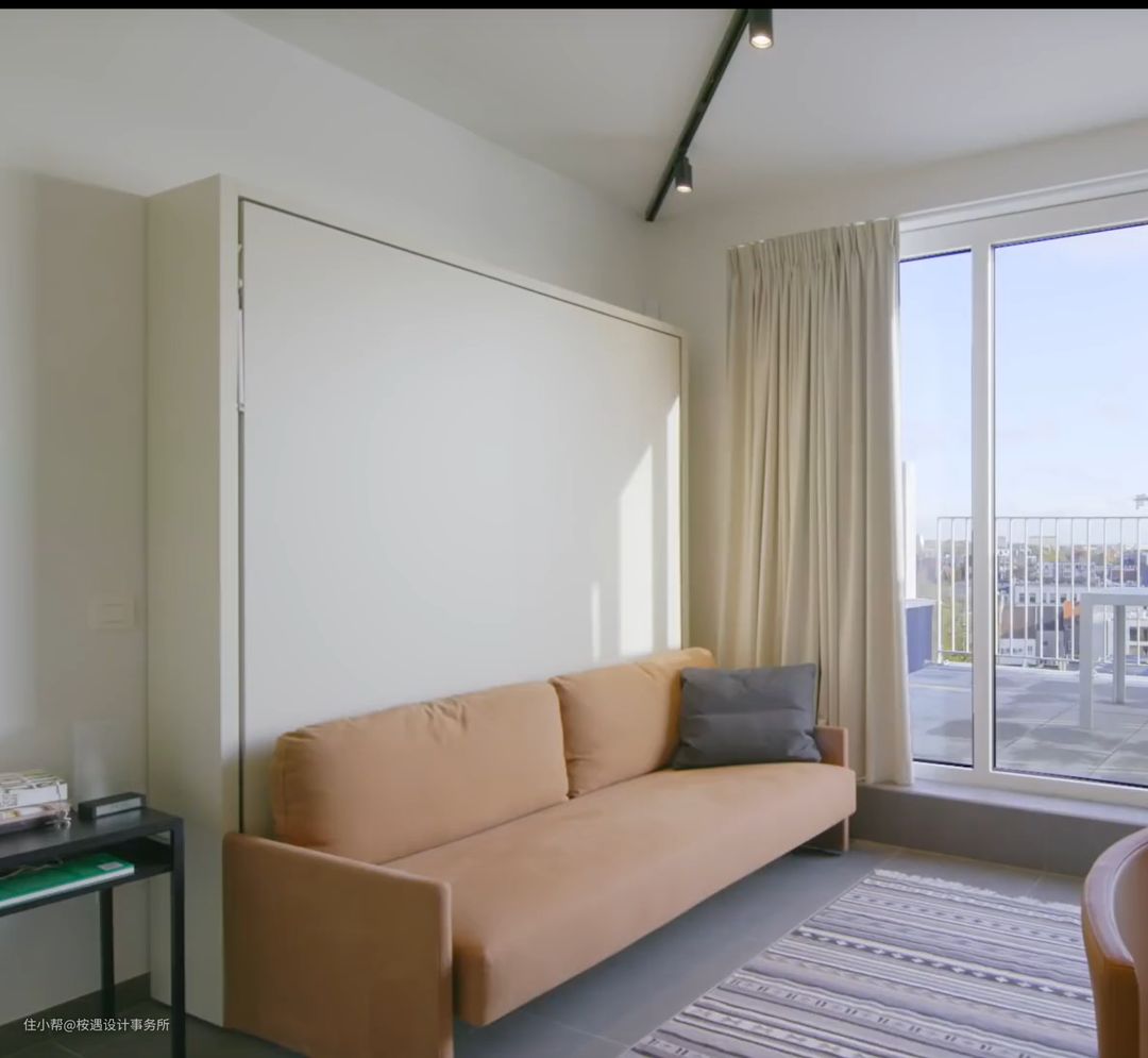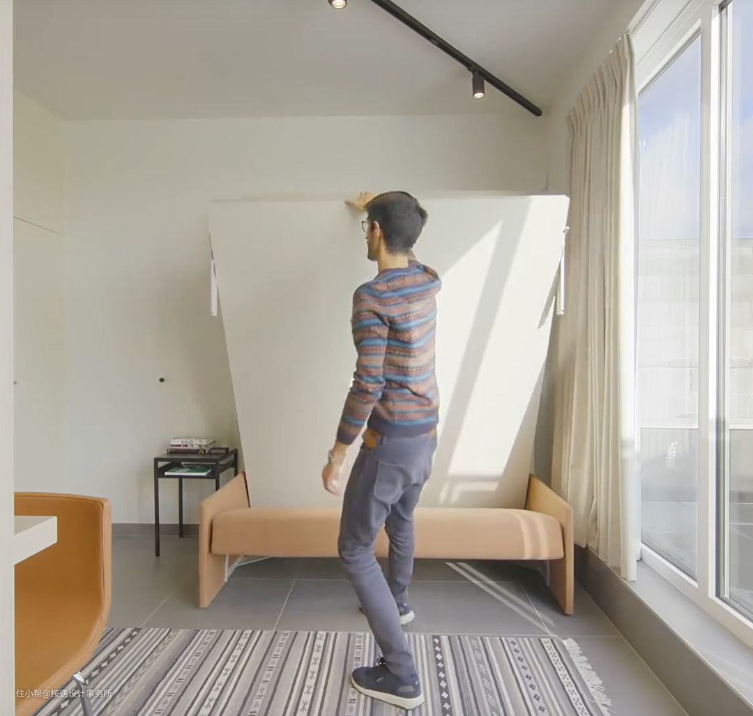 来看看这个👍👍👍小户型空间需要多利用立面空间,把床竖起来最大化的释放地面的空间。