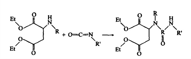 天冬聚脲是由低活性的仲胺基树脂(聚天门冬氨酸酯树脂)和脂肪族异氰酸酯组成的双组份高性能环保材料,反应产物称之为聚天门冬氨酸酯脲,简称天冬聚脲。下图为聚天门冬氨酸脂的化学反应式