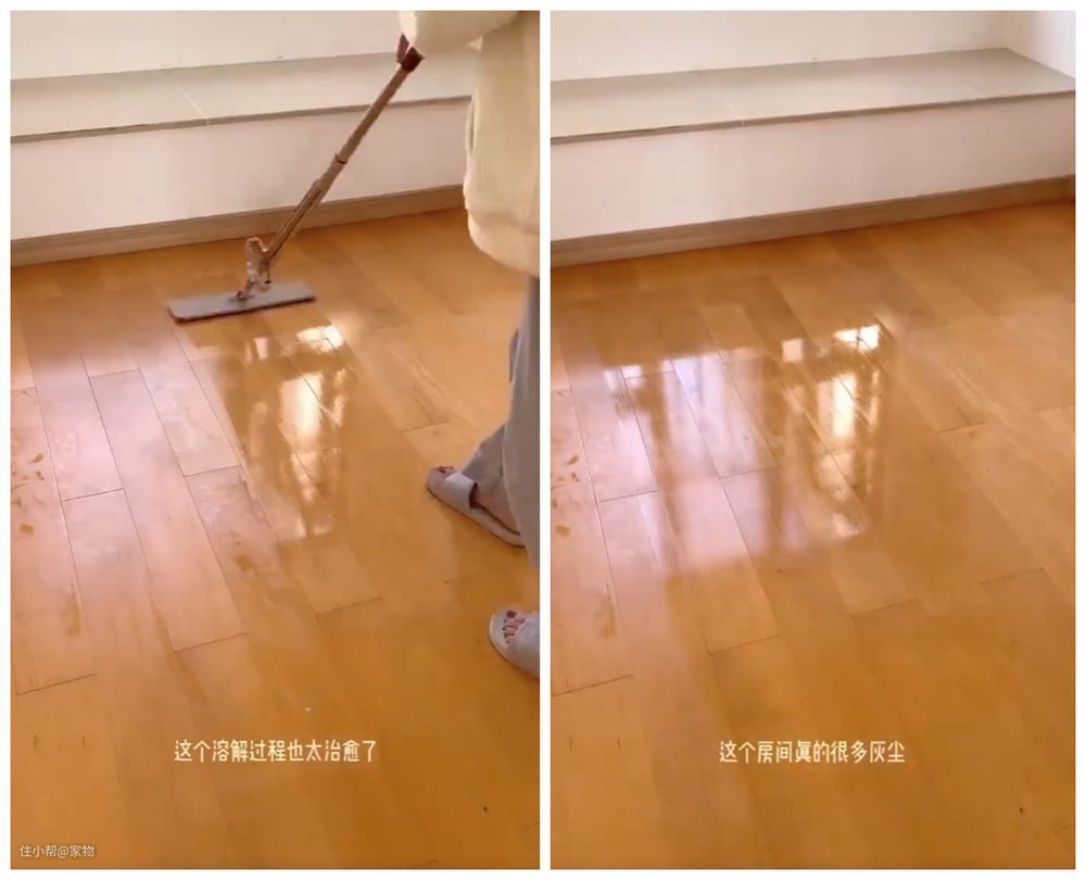 这位姑娘先对房间进行了一次整体的卫生打扫,将空置许久的房间内的灰尘一扫而净,看上去比之前好看多了。