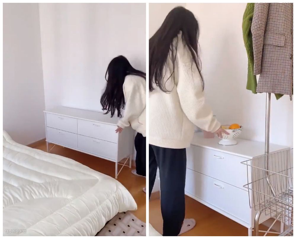 与此同时,姑娘也对这个小小的卧室空间有了个大体的规划。