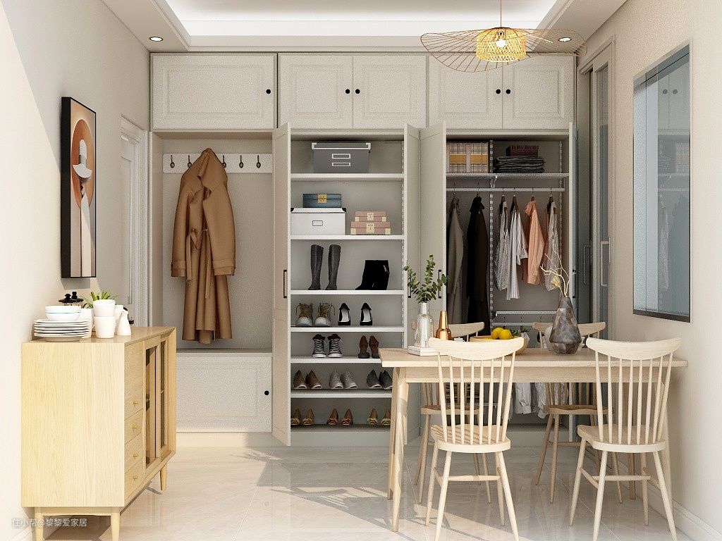 如何将狭长的玄关充分利用一直是一道难题,将一字型金属衣帽间和传统的柜体相结合,不仅提高了玄关的利用率,还实现了衣帽间的自由。