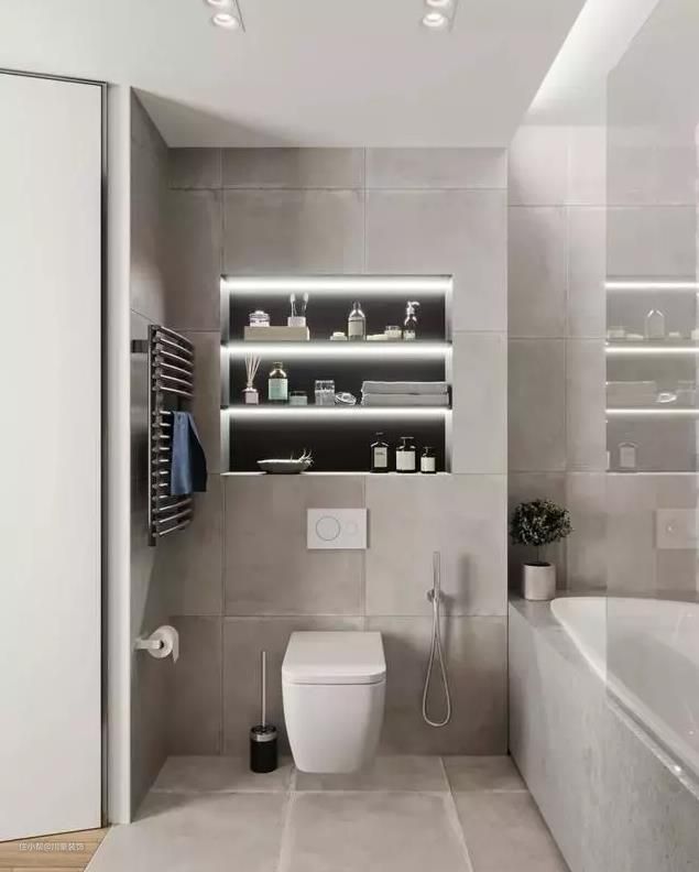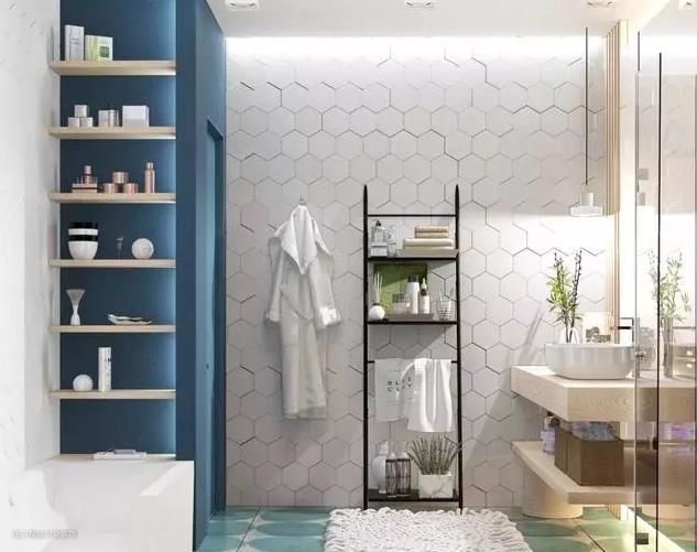 卫生间的夹缝空间或者是不规则的空间,可以安装搁板,做成类似壁龛的形式。